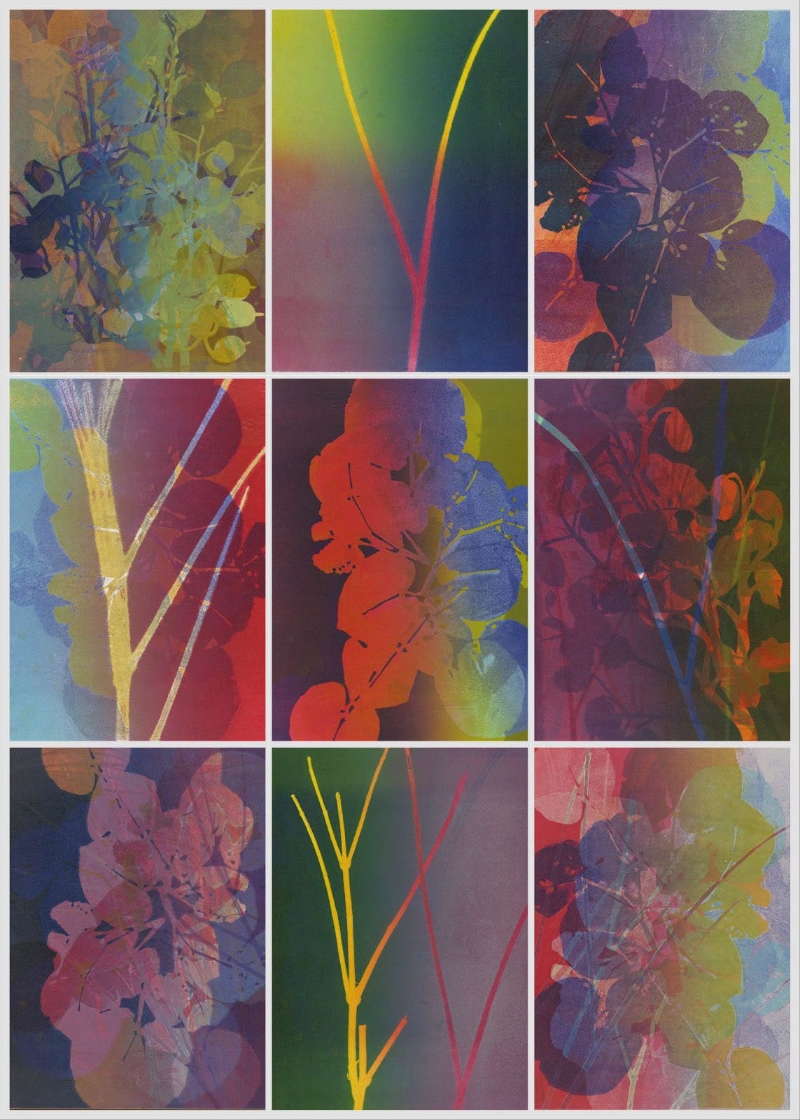 (Above: Terni 66-74/Aster Leaf, Penny + Grass, 9 Monotypes, 2023, Nina Tichava, Etching ink on paper, each monotype is 11 x 14 in) Click to enlarge.