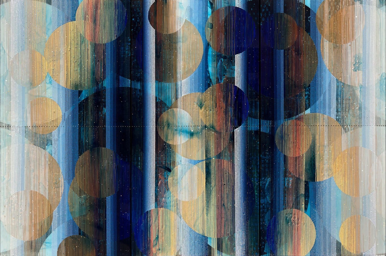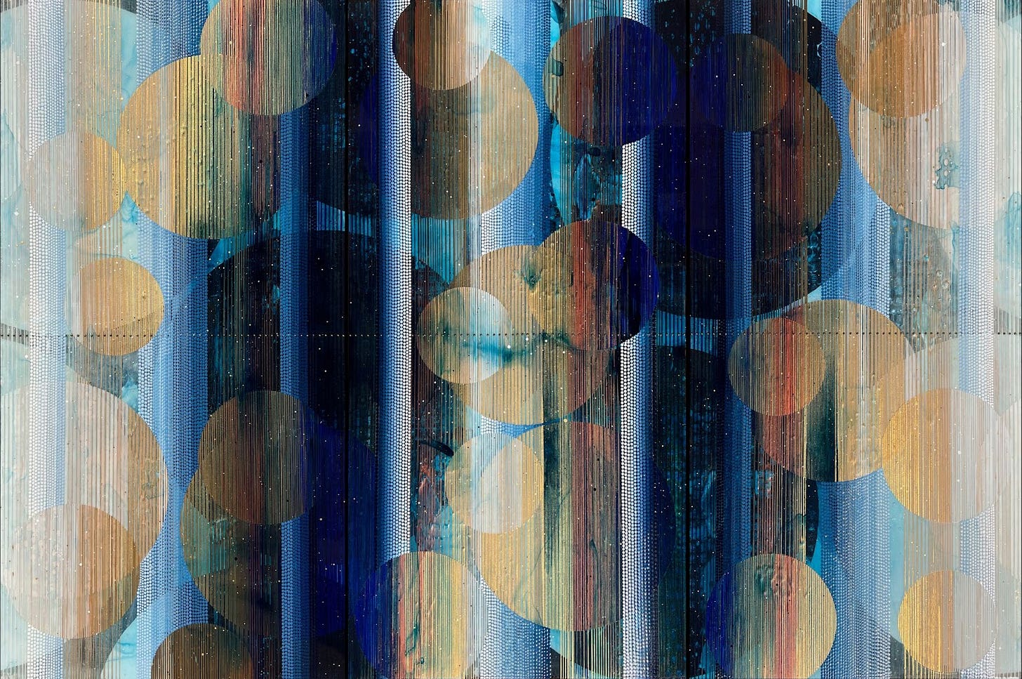 Nina has gained recognition for her large-scale paintings, often diptychs, that layer patterns, geometric elements, and natural forms to inspire a dialogue between digital and analog design and memory. Hand-painted screens of dots she refers to as “Pixels” and stripes combine with abstract brush strokes and painterly details.